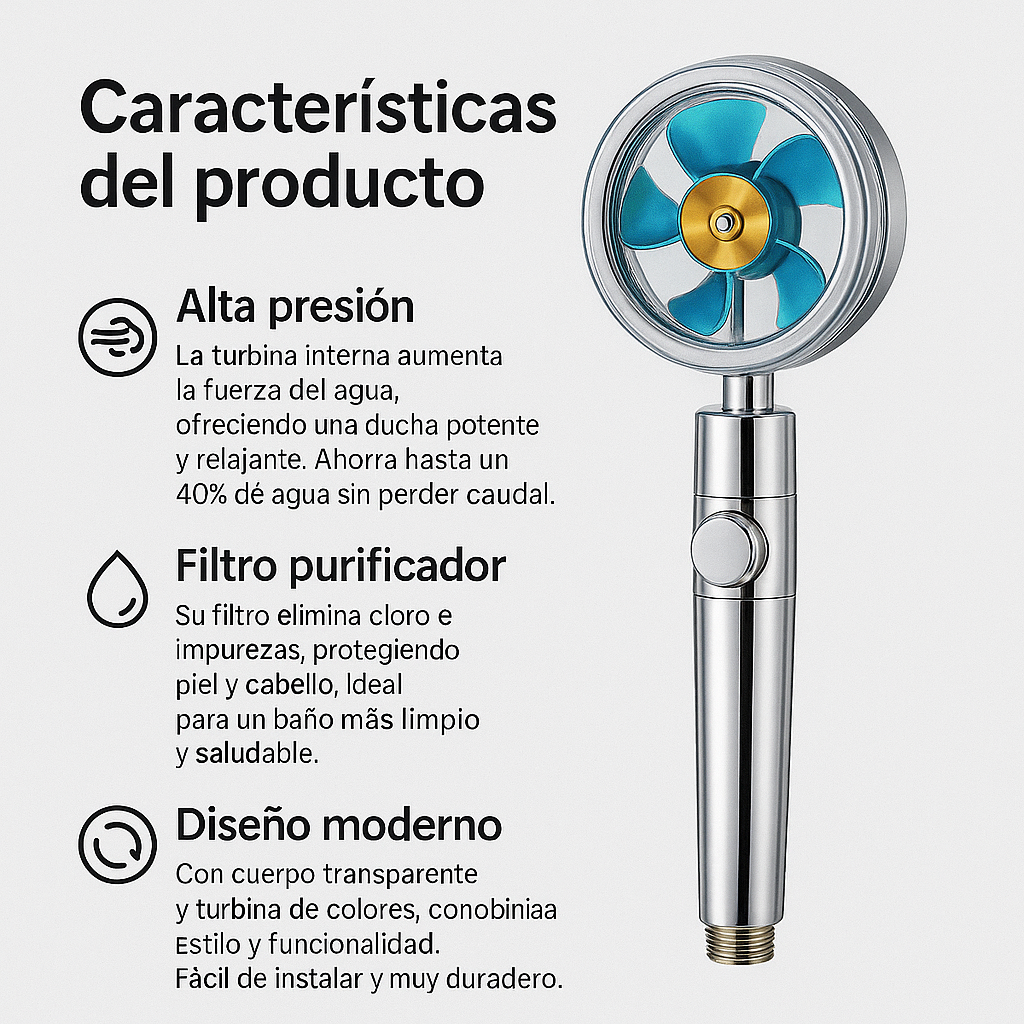 Su filtro elimina cloro e impurezas, protegiendo piel y cabello. Ideal para un baño más limpio y saludable.
